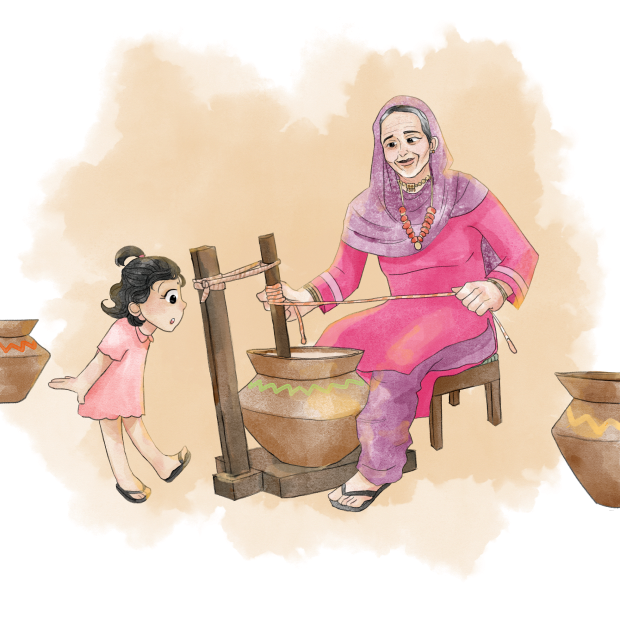 We used to play in a veranda where in one corner my dadi churned white butter. As she patiently churned butter for hours, we kept glancing over her shoulder to check if butter had formed. As soon as butter started floating on top, we sat around her with our katoris. That taste of white butter was so delicious and pure that I have never found it again anywhere.